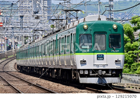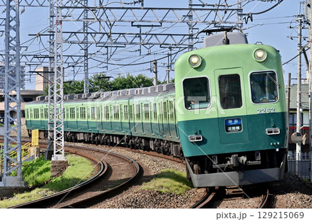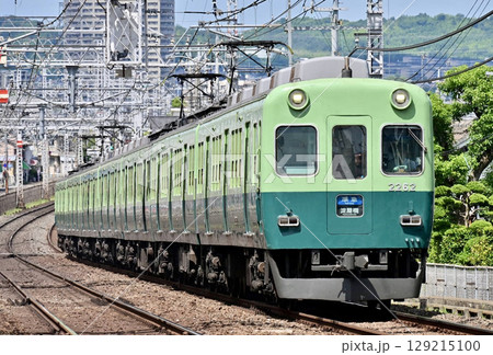 勾配を駆け上がる京阪2200系リバイバル塗装電車