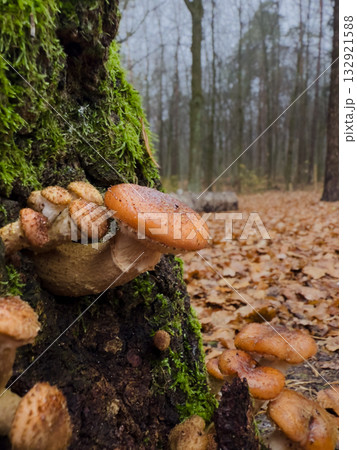 Glossy Honey Mushroom on a Moss-Covered Trunk in the Autumn Forest