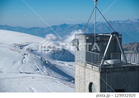 雪山の展望台に建てられた風見鶏と雪山の頂上