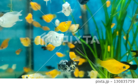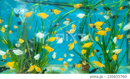 Vibrant small fish of various colors swim among lush green plants in a clean, blue-background aquarium. Ideal for pet, nature, or decor themes.