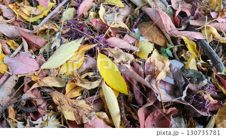 A mix of yellow and pink fallen leaves resting on dark soil, showing natural texture and autumn tones.