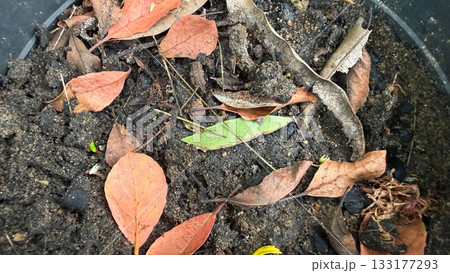 Colorful fallen leaves in various stages of decay scattered on moist soil, capturing seasonal change and natural texture.