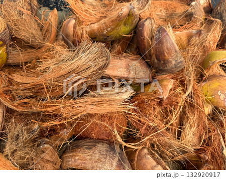 Dry and fibrous coconut husks showing coarse coir strands, ideal for illustrating organic texture, agriculture, or eco-friendly materials.