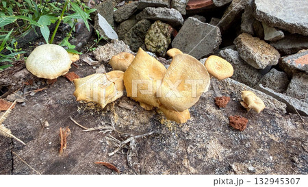 Cluster of yellowish wild mushrooms growing on decayed wood near stones, showcasing natural forest fungi life and texture.