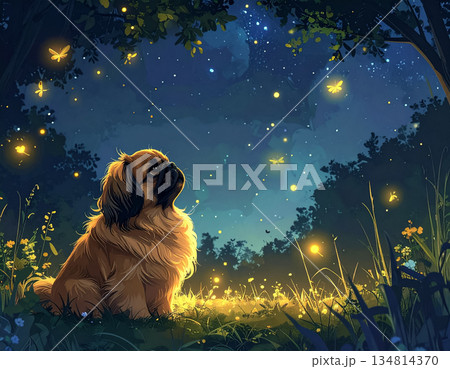 夜の森で光を見上げるペキニーズ犬の幻想世界