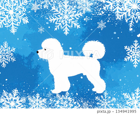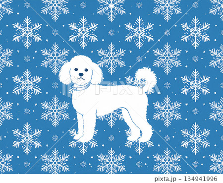 雪の結晶模様とビションフリーゼの冬イラスト背景