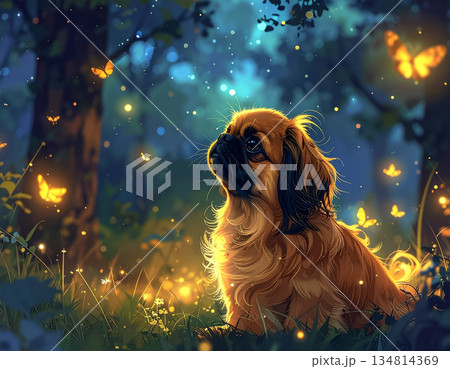 幻想的な夜の森で光に包まれるペキニーズ犬