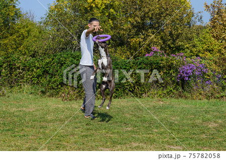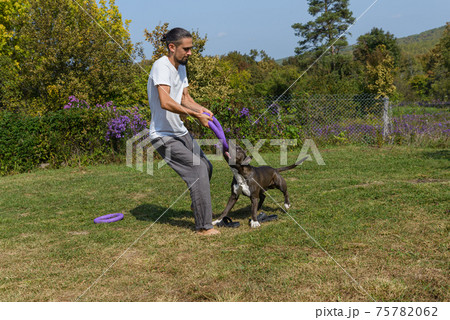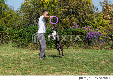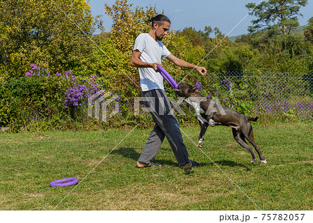 A man trains amstaff