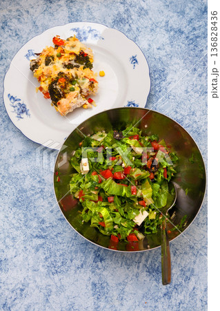Salad of Iceberg Lettuce with Vegetables and Baked Casserole of Broccoli with Chicken,.