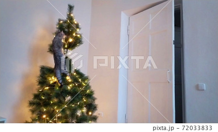 A cute playful cat climbed into the Christmas tree.