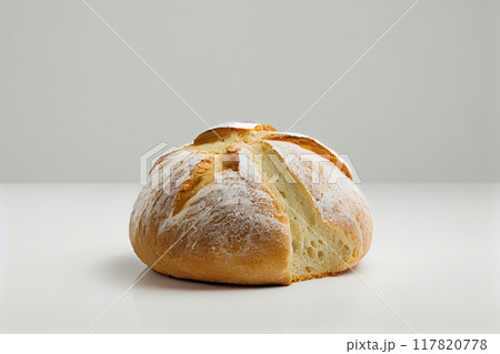 Picture of a freshly baked rustic artisan bread loaf with golden crust, isolated white background