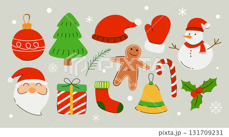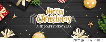 Merry christmas and happy new year greeting card banner with gifts and decorations.