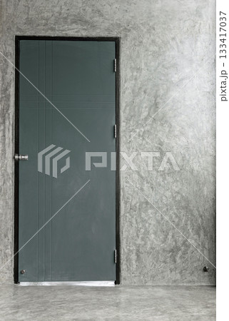 Interior entrance to a room with a closed door and bare concrete wall surface