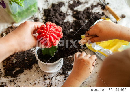 Crop mother and child planting cactus together
