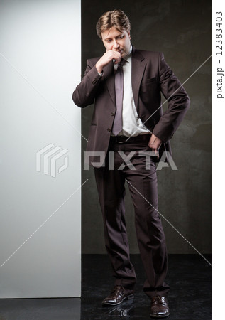 Young man in suit with banner for your text