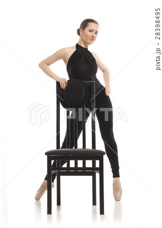 Pretty young ballerina posing with chair. Isolated
