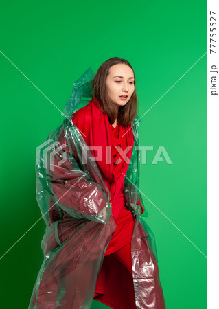 Stylish woman in plastic raincoat in studio