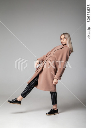 Woman in stylish coat dancing against blue background