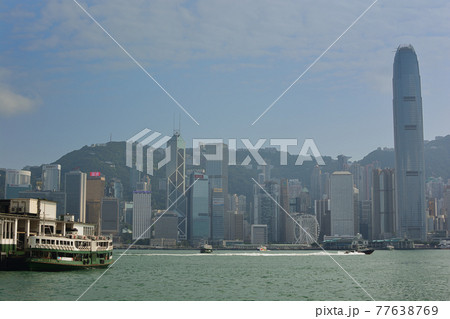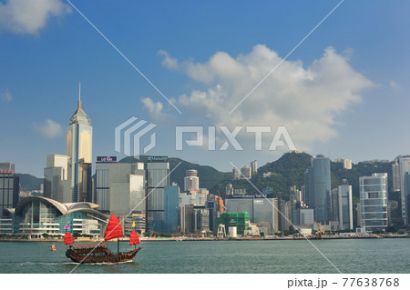香港・高層ビル街をバックにヴィクトリア・ハーバーを往くジャンク船
