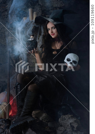 A portrait of a young sexy witch with outside. Magic, dark force, spell. Witchcraft. Halloween.