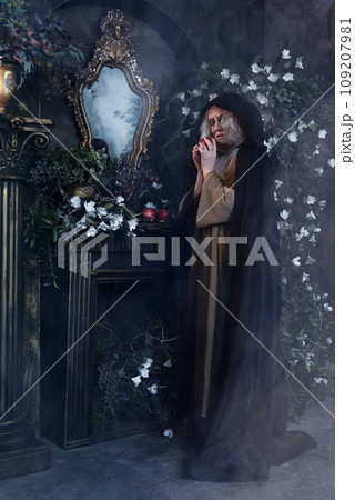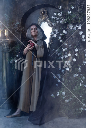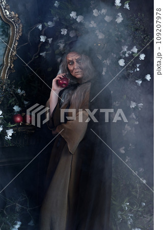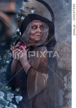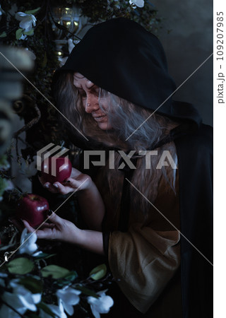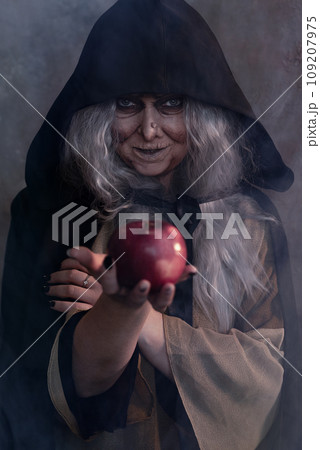 Stepmother witch gives poisoned red apple.Woman as witch in black offers red apple as symbol of temptation, poison. Fairy tale, white snow wizard concept. Spooky Halloween, cosplay.