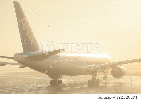 霧の中、朝日を浴びる飛行機