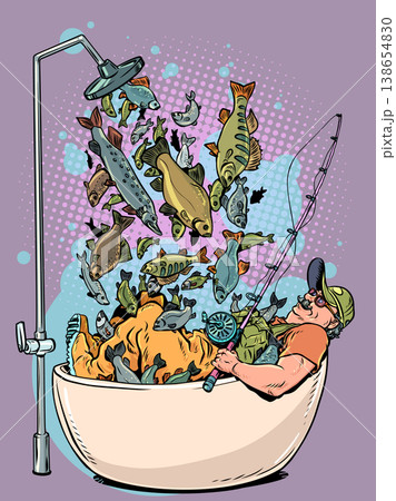 Pop Art Retro A fisherman in a bathtub. A variety of fish. A seafood restaurant.