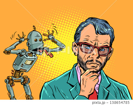 Pop Art Retro Robot sticks out tongue. Conflict with artificial intelligence. AI replacing professional employees.