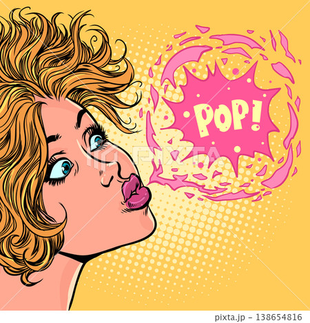 Pop Art Retro A beautiful woman makes a pop with her lips. The sound of a pop coming from her mouth. The sound of a person's gum exploding.