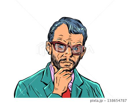Pop Art Retro Thinking and solving business problems. Businessman thinking with hand on chin. Help from a specialist in solving complex problems.