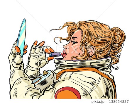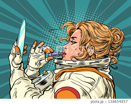Pop Art Retro Astronaut woman with lipstick. Universal global beauty. Space discounts at beauty salons.