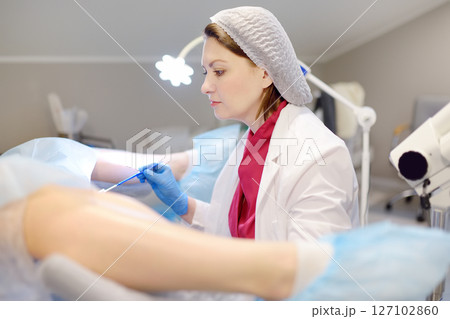 Gynecologist examines a patient using microscope in a gynecological chair. Doctor performs a colposcopy on a young girl in a modern medical office.