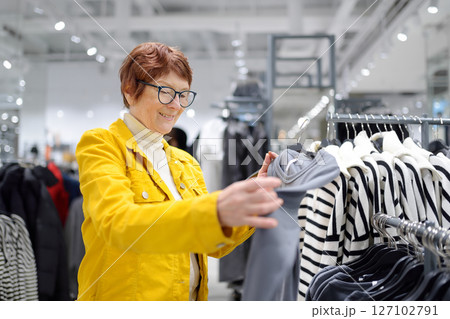 Portrait of elderly woman during shopping at mall. Red-haired senior lady meticulously chooses stylish and inexpensive clothes for herself