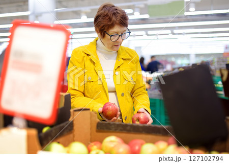 Beautiful red-haired senior lady is choosing fresh organic apples in a food store or a supermarket .