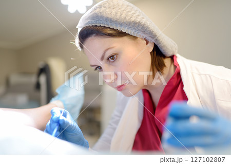 Female patient during an appointment with a rheumatologist. Doctor examines the nail bed and blood vessels of a young woman's fingers through a microscope.