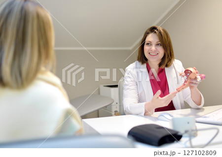 Gynecologist during appointment of patient. Doctor shows anatomical model of internal female organs and explains about disease. Gynecological consultation of treatment tactics