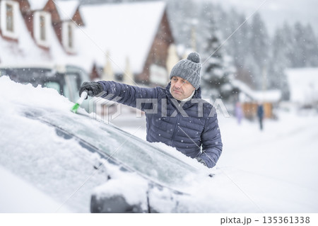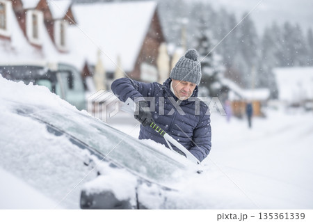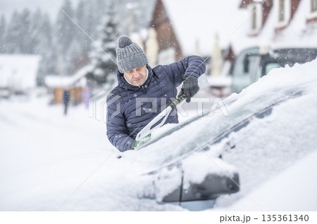 A man in a dark jacket and gray hat diligently removes a thick layer of fresh snow from the windshield of his car with a scraper and a broom. The entire scene takes place during a heavy snowfall in a
