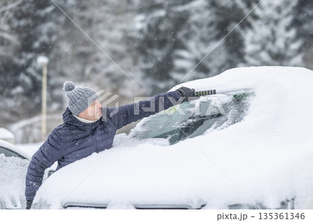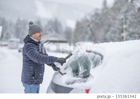 A man in a blue jacket and knit hat uses a broom to clear a thick layer of snow from the back of his car. The surrounding snowy landscape and the roof box on the vehicle suggest that he is preparing