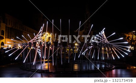 The fascinating night scene captures a modern light installation that dominates the space with a futuristic aesthetic and consists