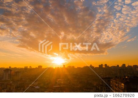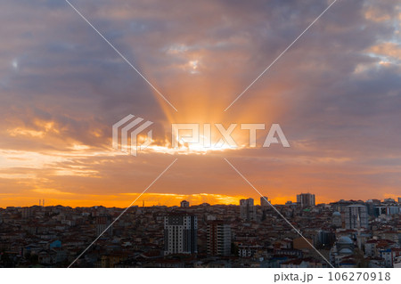 Dramatic sunset sky with the setting sun and clouds over the city, Istanbul