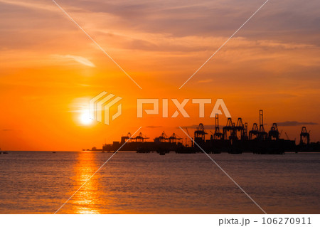 Amazing dramatic sunset over the sea, cargo port in the evening
