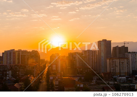 View of dramatic cloudy sunrise sky with the rising sun over the city, Batumi