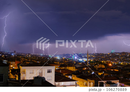 View of stormy sky with lightning strikes over the city of Istanbul at night