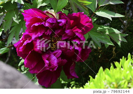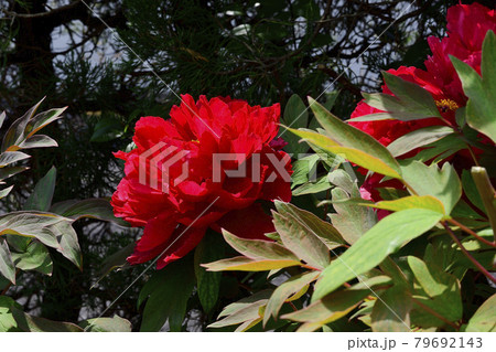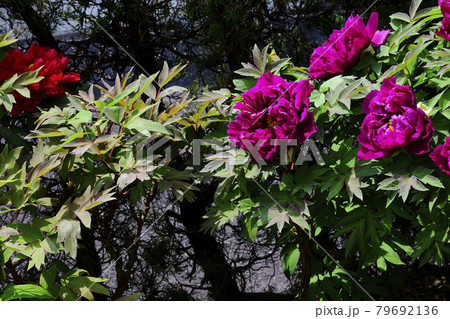 花、牡丹、赤色、紫色、自宅の庭で咲きました@南区、堺市、大阪府