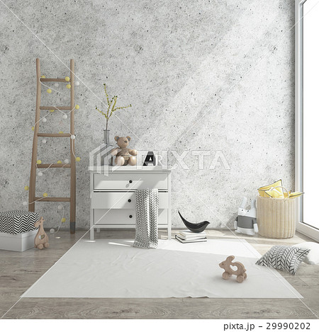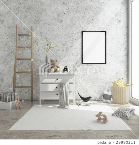 kids room interior 3d render image, pouf,presents