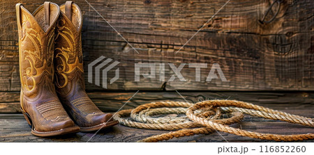 Fancy cowgirl boots with a cowboy hat and lasso rope background a wooden wall