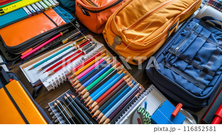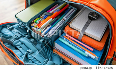 Professional photograph of a school backpack brimming with supplies. The backpack, positioned upright, is slightly open, showcasing various school essentials. Visible items include spiral notebooks,