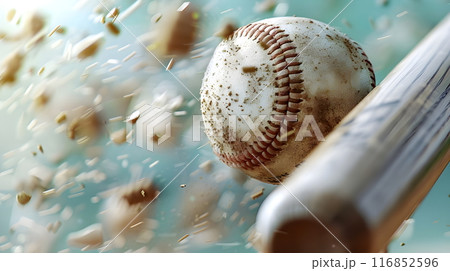 A dynamic image showing a baseball mid-air, seemingly thrown from a leather glove, with a bat poised to hit. The ball's stitches and slight dirt marks are in sharp focus, while the glove's leather