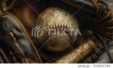 An intricately detailed image of a baseball nestled in a leather glove, with a bat resting on the ground beside it. The baseball's stitches and worn spots are vividly depicted, while the glove's