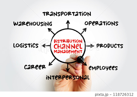 Distribution channel management - process of managing transfer of products from producer to end customer, mind map concept for presentations and reports